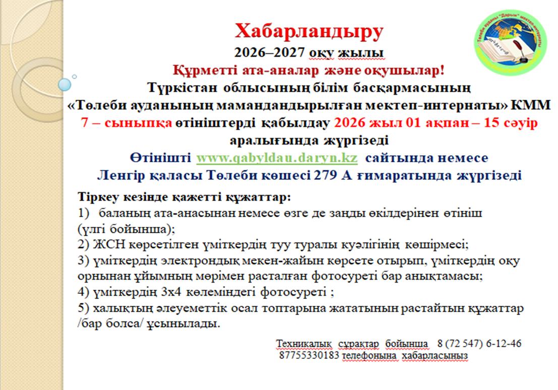 Төлеби ауданының мамандандырылған мектеп-интернаты құжаттар қабылдауды 7 – сыныпқа жүзеге асырады.