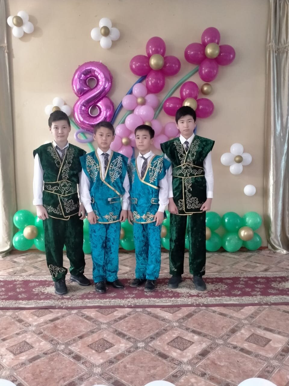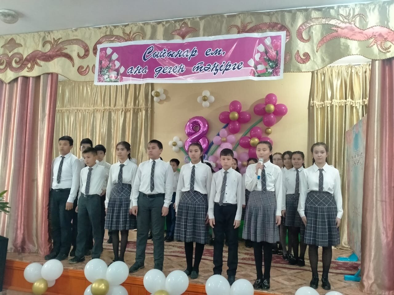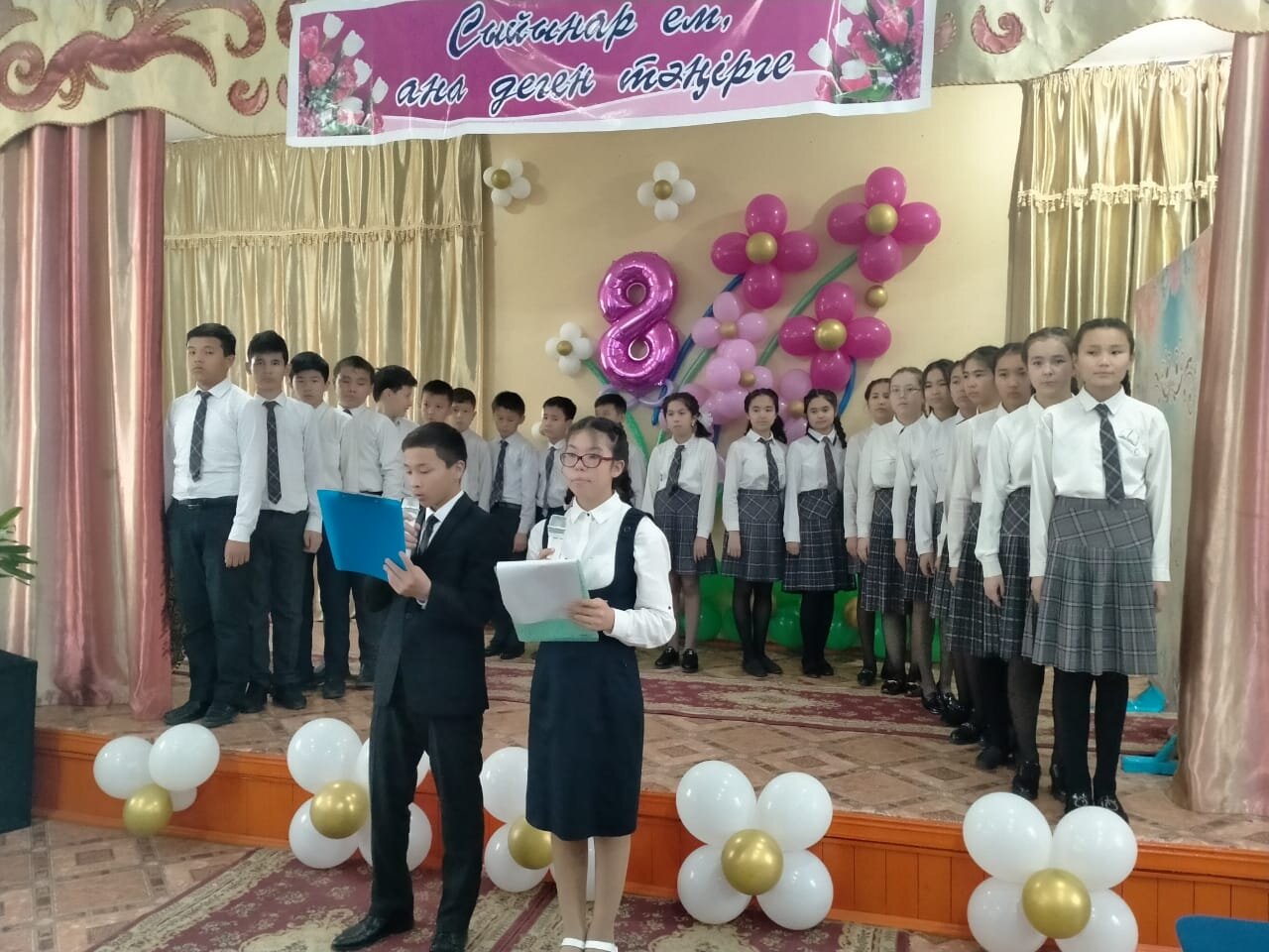 7 «Б» сыныбының ұйымдастыруымен нәзік жанды аруларымыздың қоғамдағы орнының айтарлықтай екендігін дәлелдеп, қуаныш сыйлау мақсатында «Сыйынар ем, ана деген тәңірге» атты мерекелік кеш өтті. Іс-шара барысында оқушылар ұстаздар мен ару қыздарымызға арнап ізгі тілектерін білдірді. «Кешірші, мені ана» тақырыбында қойылған көрініс арқылы көрермендерге терең ой салып, ананы қадірлей білуге шақырды. Сыныбымыздың әншілері - Тағабек Нұрасыл, Октябрь Нұрзила, Мырзалиева Айсұлу, Аселхан Қасиет аналарға арнап ән шырқады. Ұлдар «Жұмыр қылыш» биін билеп көреременді таң қалдырса, ару қыздарымыз қазақтың «Оймақ» биін мың бұрала билеп кештің көркін қыздыра түсті. Кеш соңында заманауи би билеп, мектебіміздің нәзік жанды ұстаздары мен тәрбиешілеріне сыныптың атынан сыйлықтарын табыстады.