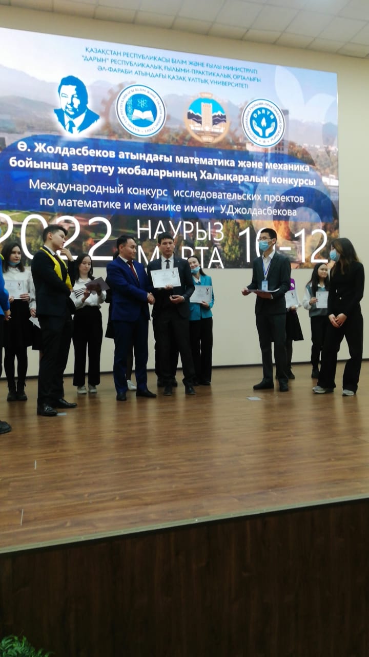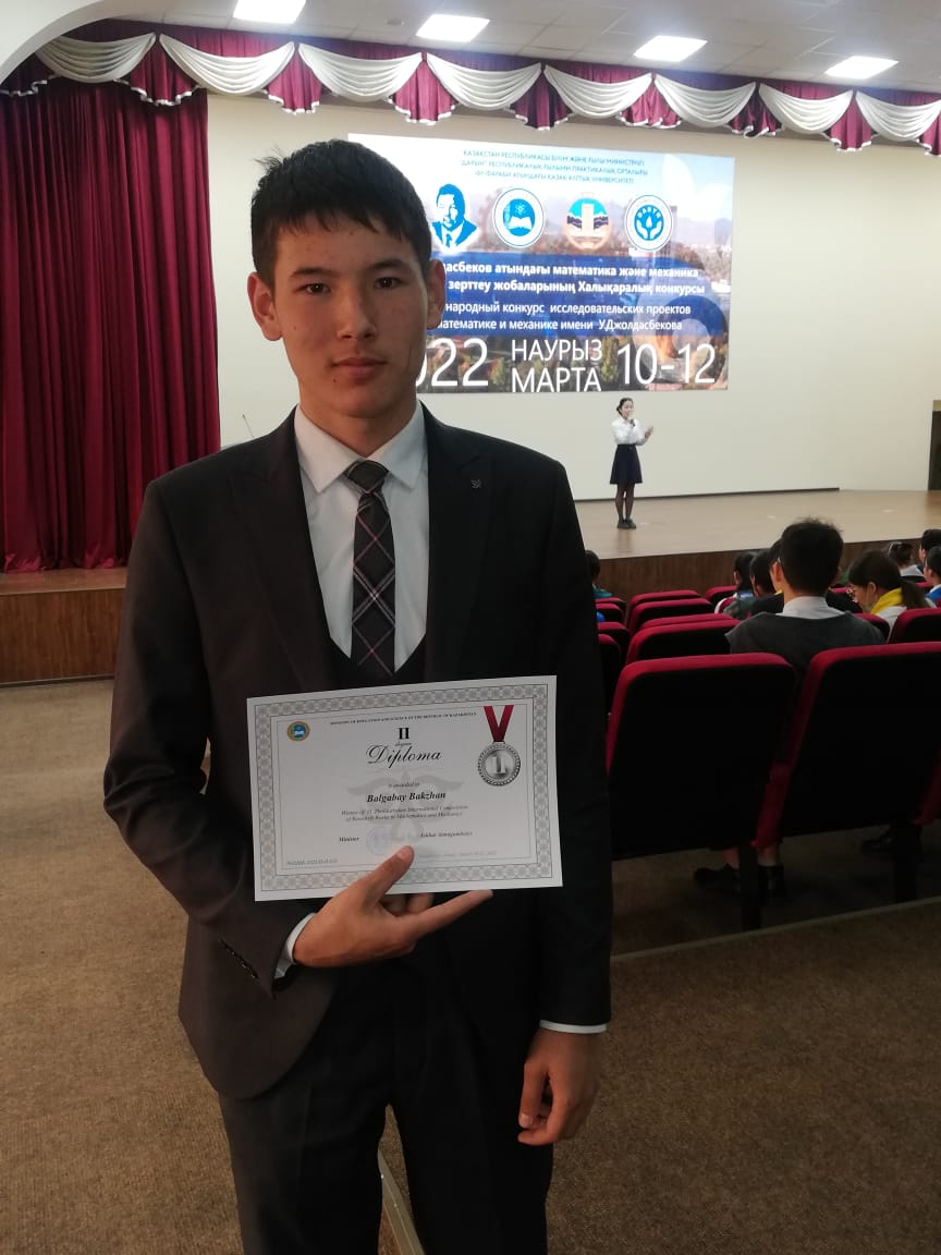 Халықаралық ғылыми жобалар конкурсының жеңімпаздарын құттықтаймыз! 2022 жылы 10-12 наурыз аралығында Алматы қаласы, Әл-Фараби атындағы Қазақ ұлттық университетінің базасында өткен Ө.Жолдасбеков атындағы математика және механика бойынша зерттеу жобаларының XII халықаралық конкурсының нәтижесі бойынша мектеп-интернатымыздың 10 сынып оқушысы Балғабай Бағжан ІІ орын алып марапатталды. Жетекшісі: Мусрепбаева Бибігүл.