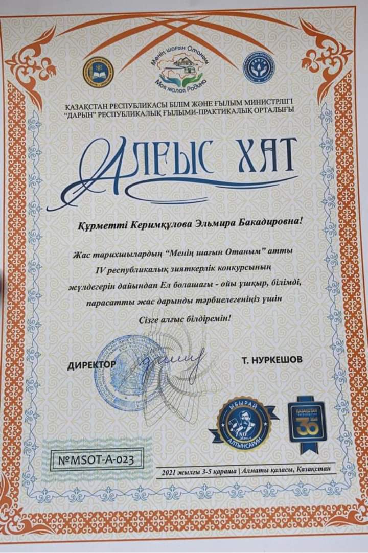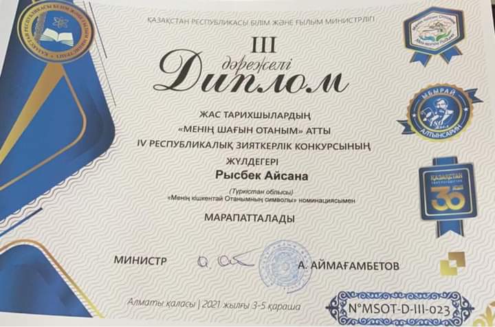 "Менің кішкентай Отанымның символы" бойынша Төлеби ауданы мамандандырылған мектеп-интернатының оқушысы Рысбек Айсана ІІІ-дәрежелі дипломмен марапатталды. Оқушыларды және жетекшілерін шын жүректен құттықтаймыз!